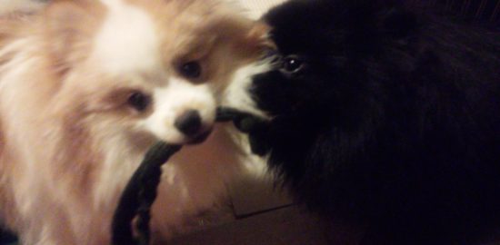お父さんのヘアバンドGET!ふたりで引っ張り合いで力比べ。弟も力が強くなって、楽しくなってきたよ…